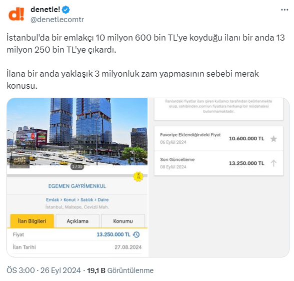 İstanbul'da bir emlakçı 10 milyon 600 bin TL'ye koyduğu ilanı bir anda 13 milyon 250 bin TL'ye çıkardı.