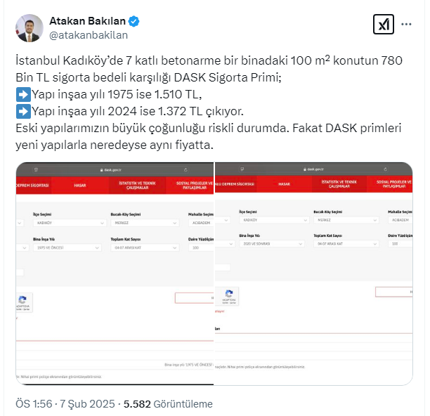 İnşaat Mühendisi Atakan Bakılan,da konuyla ilgili sosyal medya hesabından, İstanbul Kadıköy’de 7 katlı betonarme bir binadaki 100 metrekare konutun 780 Bin TL sigorta bedeli karşılığı DASK Sigorta Primini hesapladı. Buna göre; Yapı inşaa yılı 1975 ise 1.510 TL, yapı inşaa yılı 2024 ise 1.372 TL olarak çıkıyor.