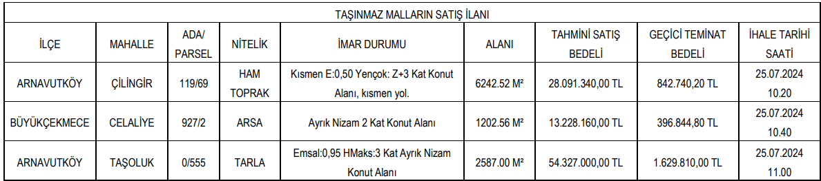 Büyükçekmece Celaliye'de yer alan arsanın ise satış bedeli 13 milyon 228 bin 160 TL olarak geçici teminat bedeli ise 396 bin 844 TL olarak açıklandı. Satışa çıkarılan gayrimenkullerin alanları 1.202 metrekare ile 6 bin 242 metrekare arasında değişiyor.