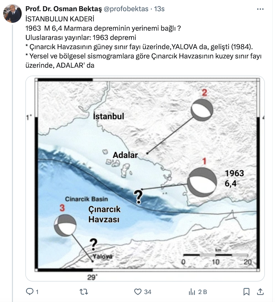 Jeoloji Mühendisi Prof. Dr. Osman Bektaş, https://x.com/profobektas resmi X sosyal medya hesabından İstanbul depremi ile ilgili çok önemli bir paylaşım yaptı. Osman Bektaş paylaşımında “İstanbul’un kaderi 1963’teki 6,4’lük Marmara depreminin yerinemi bağlı?” sorusuna yanıt verdi.