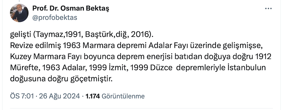 Jeoloji Mühendisi Prof. Dr. Osman Bektaş resmi sosyal medya hesabı üzerinden yaptığı paylaşımda “İstanbul’un kaderi 1963’teki 6,4’lük Marmara depreminin yerinemi bağlı?” sorusuna yanıt verdi.