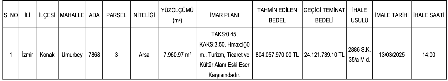 Arsanın satış ihalesi 13 Mart 2025 tarihinde saat 14.00’te İzmir Büyükşehir Belediyesi Encümen Toplantı Salonu'nda komisyon huzurunda yapılacak.