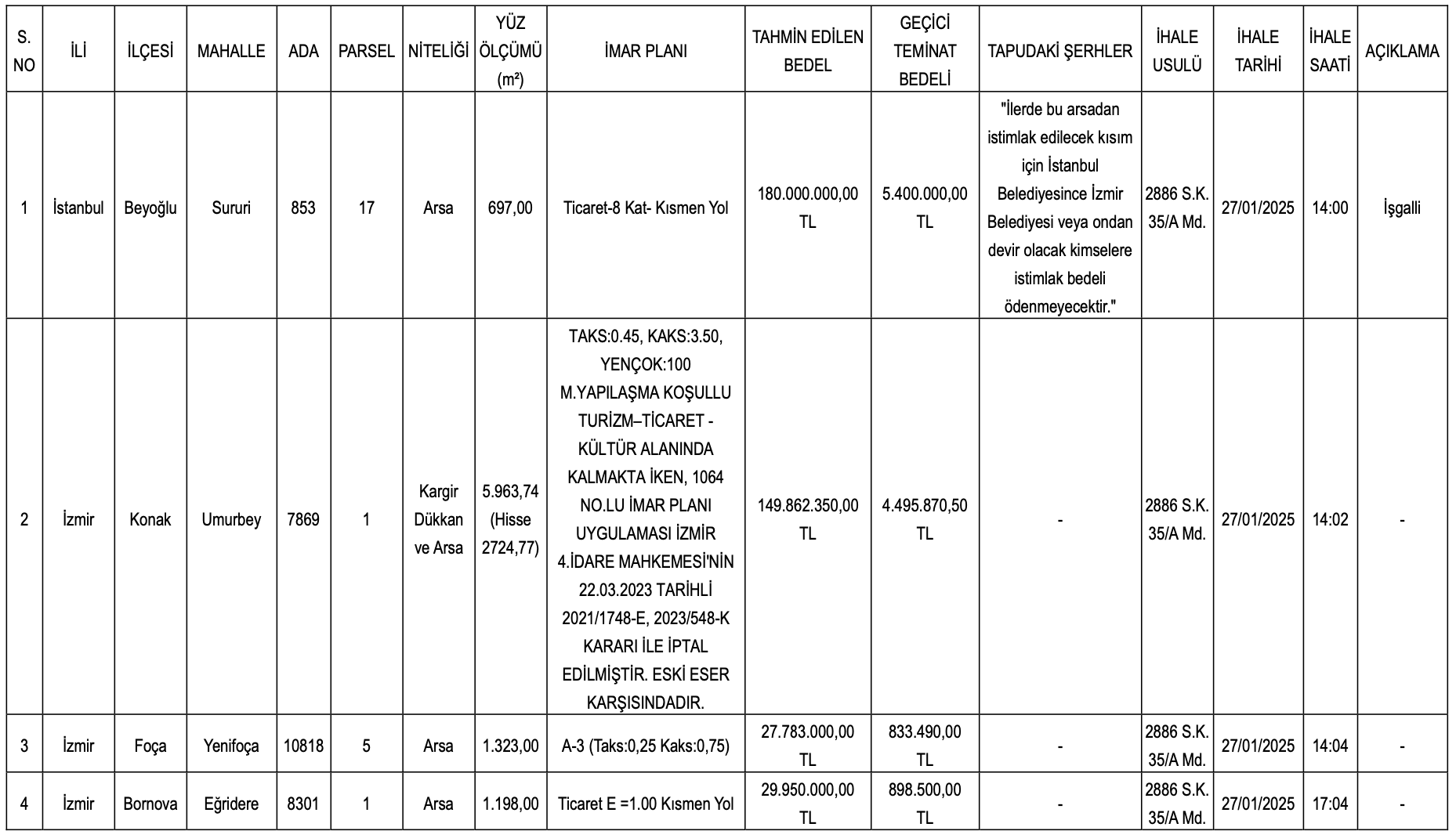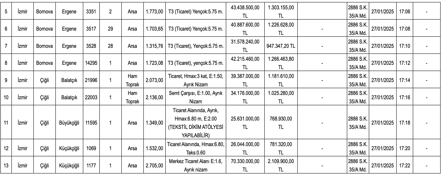 Bugünkü Resmi Gazete’de yayımlanan satış listesinde Çiğli ve Bornova’dan 5, Konak ve Foça’dan birer taşınmaz yer alıyor. İzmir ve İstanbul’da yer alan arsa ve araziler için en yüksek muhammen bedel 180 milyon TL, en düşük muhammen bedel 25 milyon 631 bin TL olarak açıklanırken, en yüksek geçici teminat bedeli 5 milyon 400 bin TL, en düşük geçici teminat bedeli ise 768 bin 930 TL olarak açıklandı.