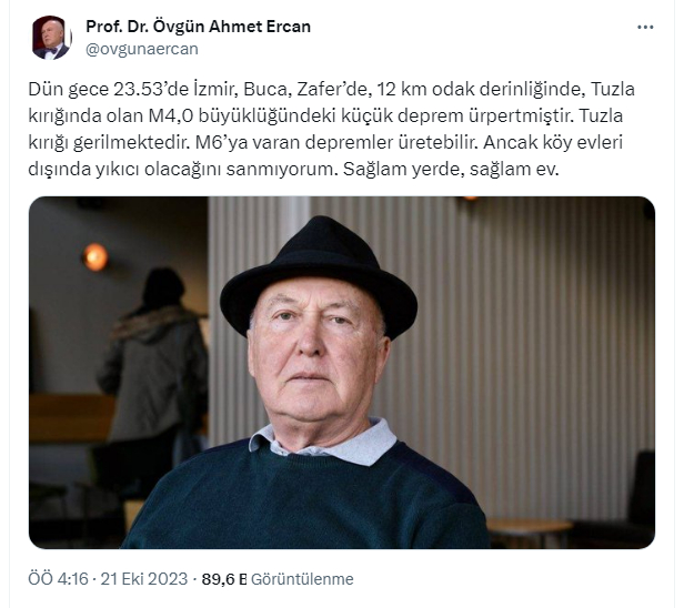 "Dün gece 23.53’de İzmir, Buca, Zafer’de, 12 km odak derinliğinde, Tuzla kırığında olan M4,0 büyüklüğündeki küçük deprem ürpertmiştir. Tuzla kırığı gerilmektedir. M6’ya varan depremler üretebilir. Ancak köy evleri dışında yıkıcı olacağını sanmıyorum. Sağlam yerde, sağlam ev."