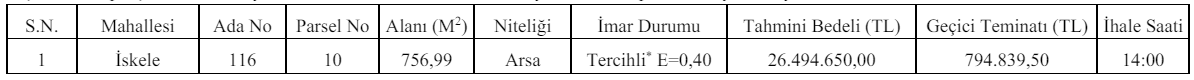 İhale, Taşınmaz Satış Şartnamesinde belirtilen hususlar doğrultusunda 15 Temmuz Milli İrade Kent Meydanında bulunan Hacı Halil Mah. Şehit