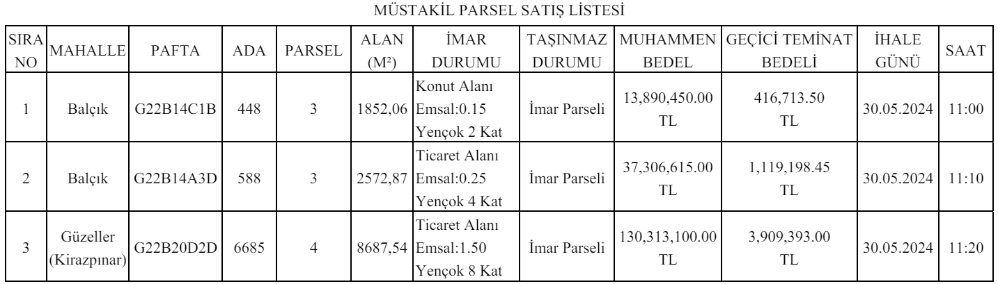 durumu, muhammen bedeli ve geçici teminat bedeli yazılı 3 adet parsel satışa çıkarılmıştır.