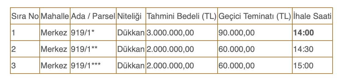 Merkez Mahallesi’nde yer alan dükkanların muhammen bedelleri 2 milyon TL ve 3 milyon TL olarak açıklanırken, geçici teminat bedelleri ise 60 bin TL ve 90 bin TL olarak açıklandı.