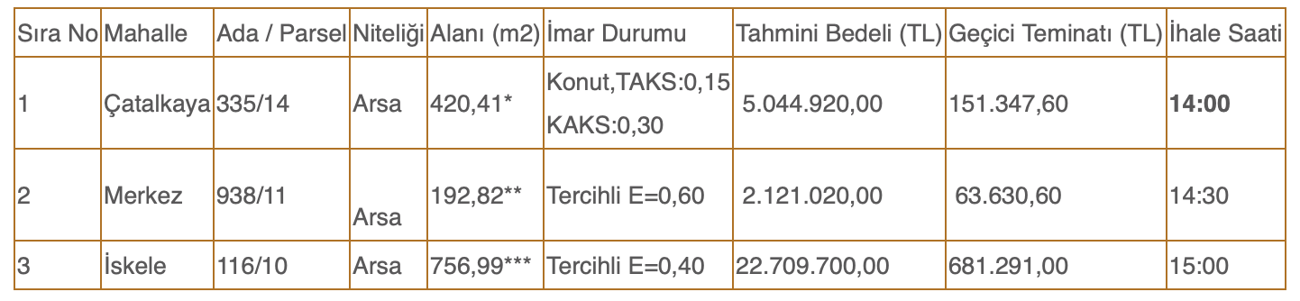Satışa çıkarılan arsaların tahmini satış bedelleri 2 milyon 121 bin 20 TL ile 22 milyon 709 bin 700 TL arasında farklılık gösterirken, geçici teminat bedelleri ise. 63 bin 630,60 TL ile 681 bin 291 TL arasında farklılık gösteriyor.