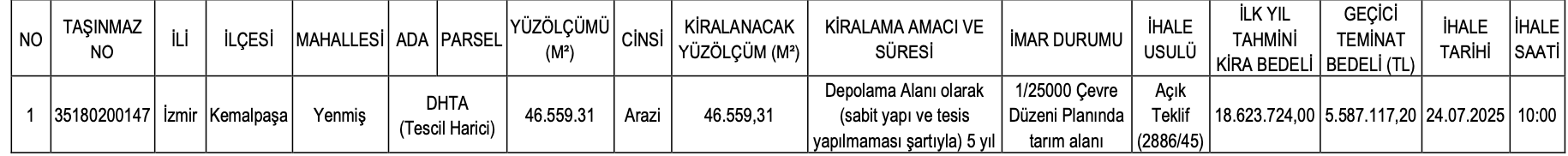 Yenmiş Mahallesi’nde yer alan arsa 46 bin 559,31 metrekare alana sahip. Depolama alanı olarak 5 yıllığına kiraya verilecek olan arsanın ilk yıl tahmini kira bedeli 18 milyon 623 bin 724 TL olarak açıklanırken, geçici teminat bedeli ise 5 milyon 587 bin 117,20 TL olarak açıklandı.