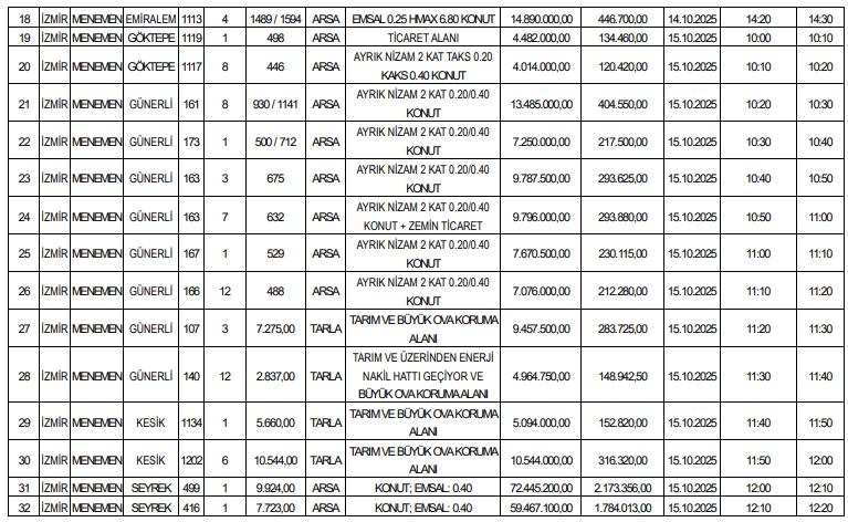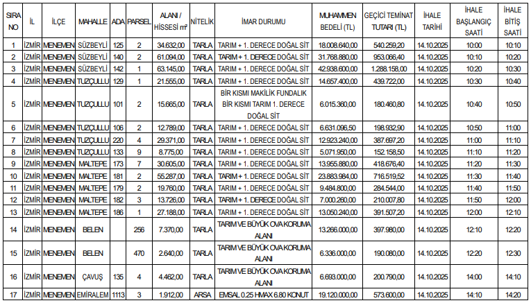 İhaleler, Camiikebir Mah. Şehit Kemal Caddesi No:1 adresinde bulunan Menemen Belediyesi Meclis Salonunda Belediye Encümeni tarafından belirtilen saat ve tarihlerde yapılacak. Söz konusu arsaların ihalesi 14 Ekim 2025 tarihinde 10:10 ile 14:30 arasında yapılacak.