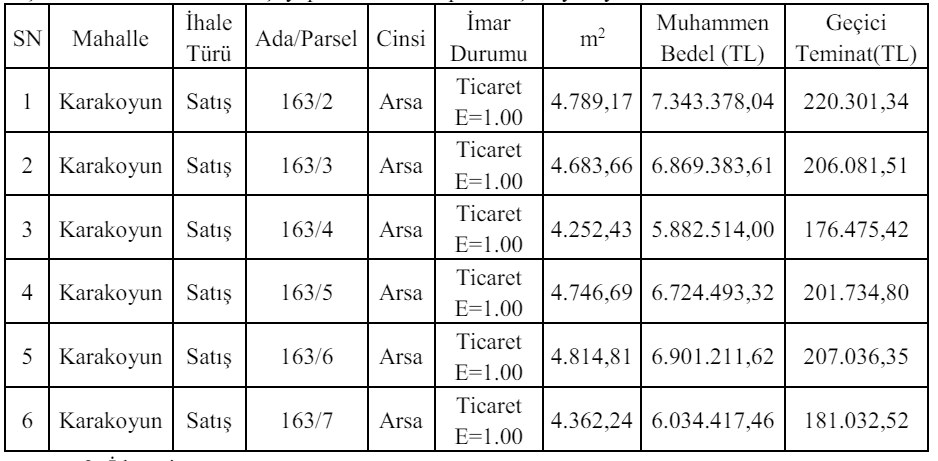 1- Belediyemiz mülkiyetinde bulunan, aşağıda nitelikleri belirtilen arsaların satış ihalesi