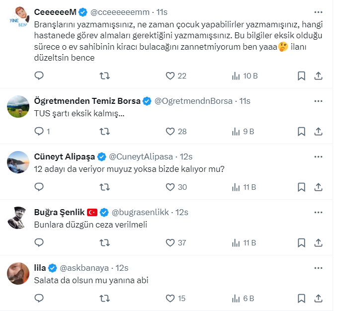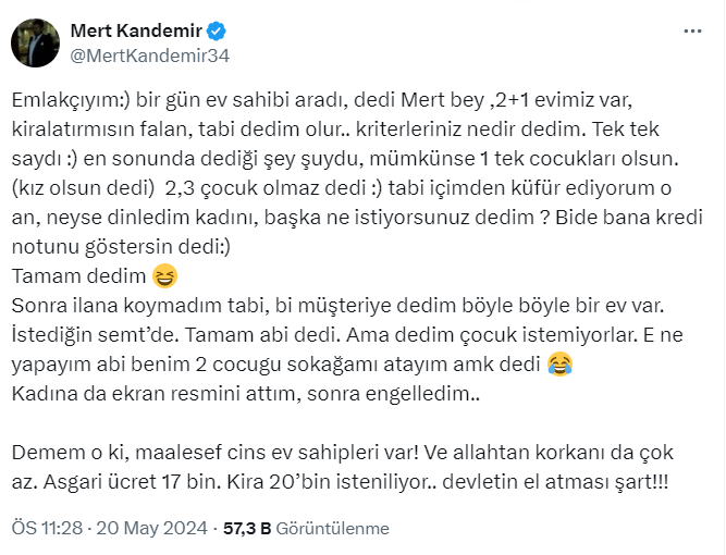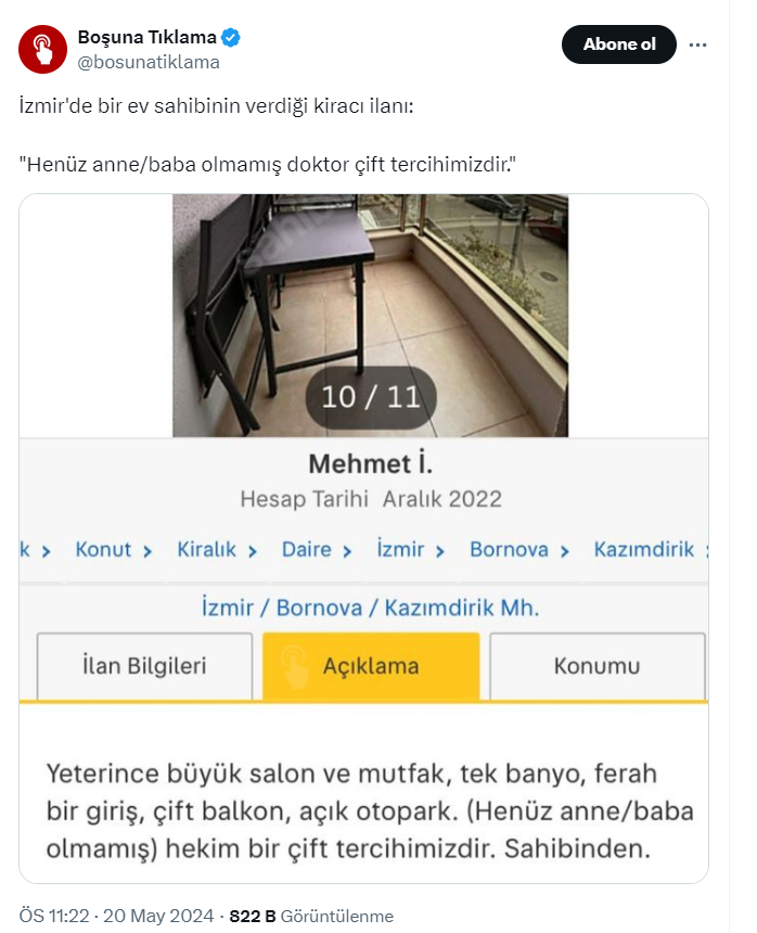 Ev sahipleri ve kiracılar arasında sert rüzgarlar eserken, 1 milyon takipçili Boşuna Tıklama, X hesabı https://x.com/bosunatiklama üzerinden İzmir'de bir ev sahibinin verdiği kiracı ilanını paylaştı. İlandaki 'Henüz anne/baba olmamış doktor çift tercihimizdir' detayı dikkat çekti.