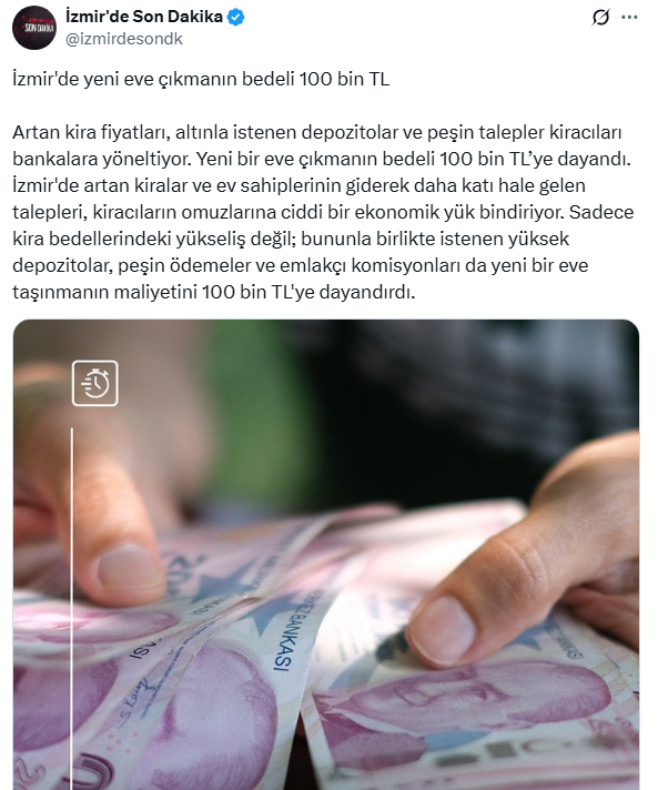İzmir'de son dakika sosyal medya hesabından İzmir'deki kira fiyatlarına ve fahiş depozitolar, peşin ödemeler ve emlakçı komisyonlarını kaleme alarak maliyet hesaplaması yaptı.