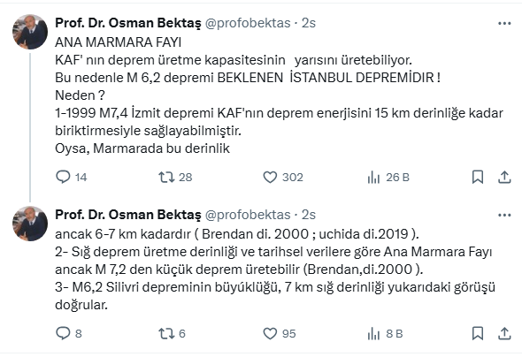 İstanbul'da meydana gelen 6,2 şiddetindeki depremin ardından gözler büyük Marmara depremine çevridi. Milyonlarca İstanbullu İstanbul'da deprem olup olmayacağını, kaç şiddetinde olacağını araştırmaya devam ediyor. Konuyla ilgili Jeoloji Mühendisi Prof. Dr. Osman Bektaş, sosyal medya hesabından, açıklama yaptı. Bektaş, Ana Marmara fay hattını değerlendirerek 6,2 şiddetinde deprem uyarısında bulundu.