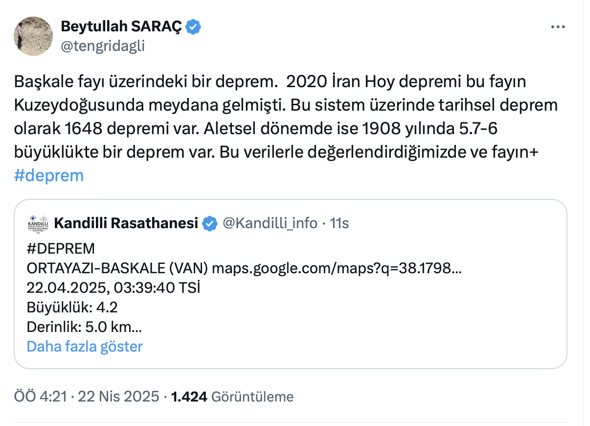 Jeoloji Yüksek Mühendisi Beytullah Saraç resmi sosyal medya hesabı https://x.com/tengridagli üzerinden yaptığı paylaşımda “Başkale fayı üzerindeki bir deprem. 2020 İran Hoy depremi bu fayın Kuzeydoğusunda meydana gelmişti. Bu sistem üzerinde tarihsel deprem olarak 1648 depremi var. Aletsel dönemde ise 1908 yılında 5.7-6 büyüklükte bir deprem var. Bu verilerle değerlendirdiğimizde ve fayın potansiyelini göze aldığımızda 6.5-7 arası deprem üretebilir.” İfadelerini kullandı.