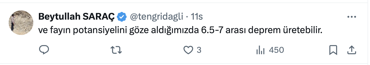 Jeoloji Yüksek Mühendisi Beytullah Saraç da kısa süreli olarak endişe yaratan deprem ile ilgili çok önemli bir paylaşım yaptı.