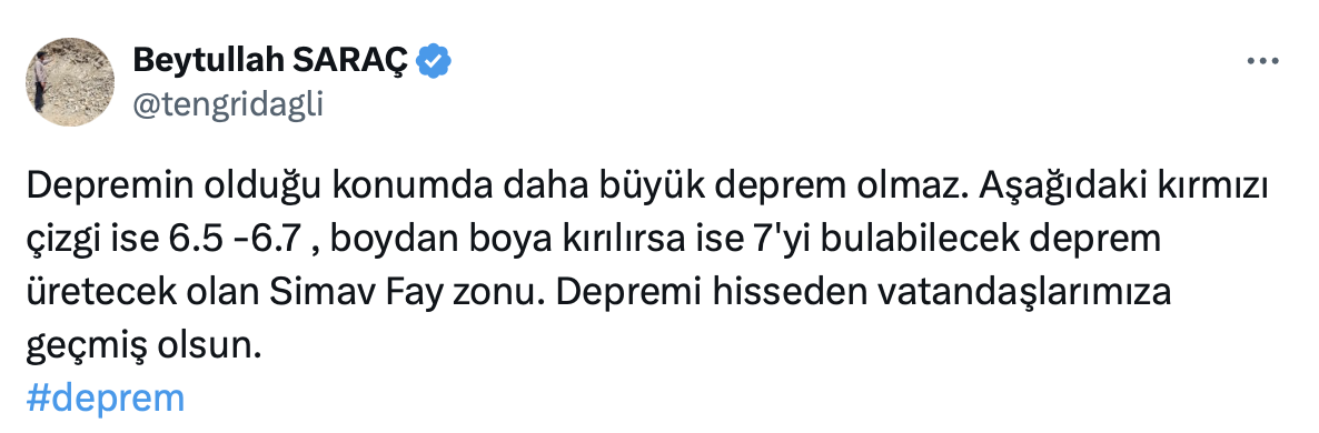 Beytullah Saraç resmi sosyal medya hesabı https://x.com/tengridagli üzerinden yaptığı paylaşımda depremin olduğu konumda daha büyük deprem olmayacağını belirtti.