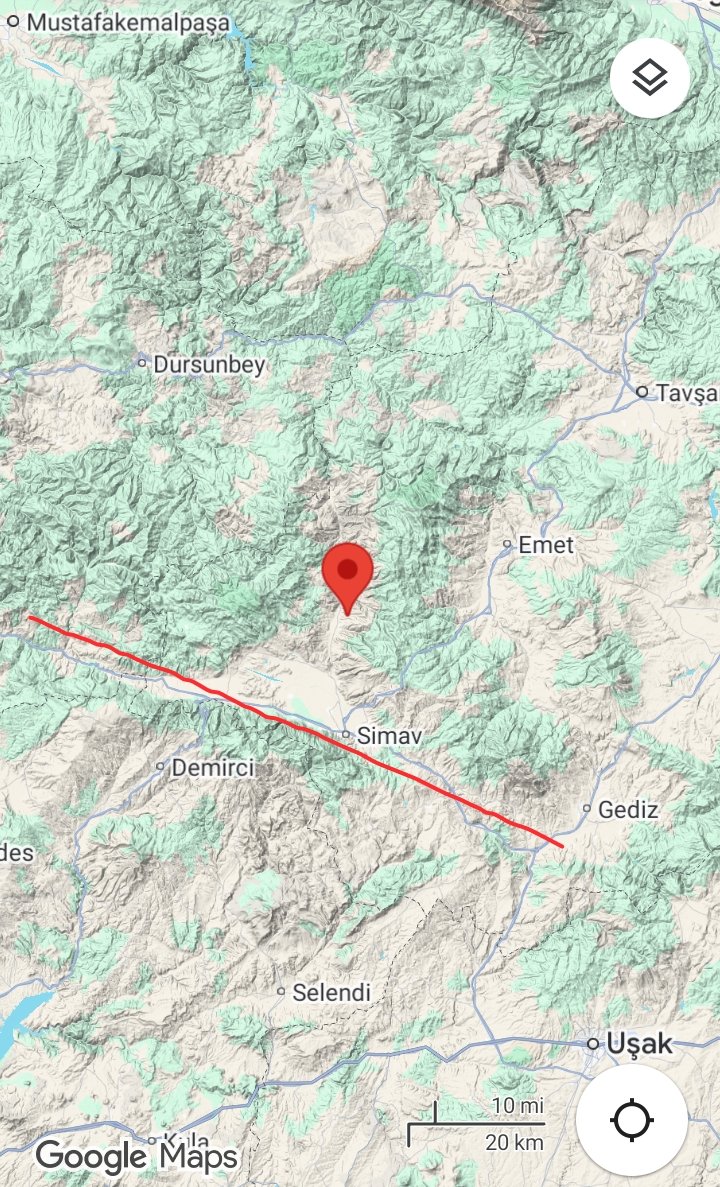 Depremin olduğu konumda daha büyük deprem olmaz. Aşağıdaki kırmızı çizgi ise 6.5 -6.7 , boydan boya kırılırsa ise 7'yi bulabilecek deprem üretecek olan Simav Fay zonu. Depremi hisseden vatandaşlarımıza geçmiş olsun.