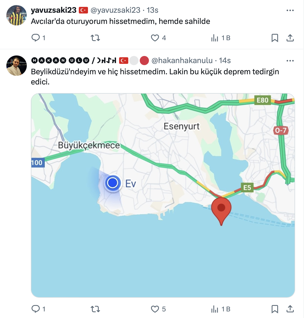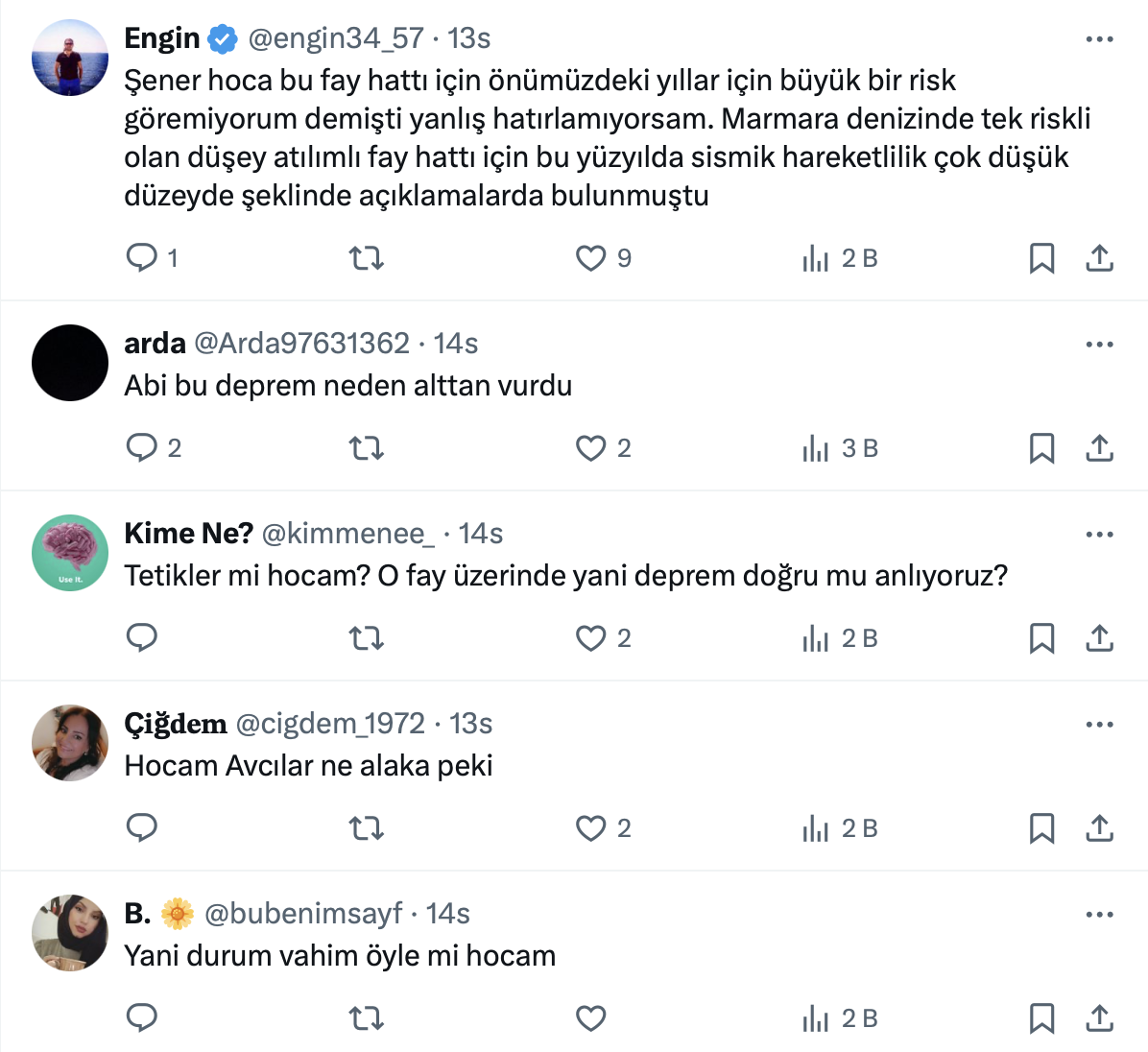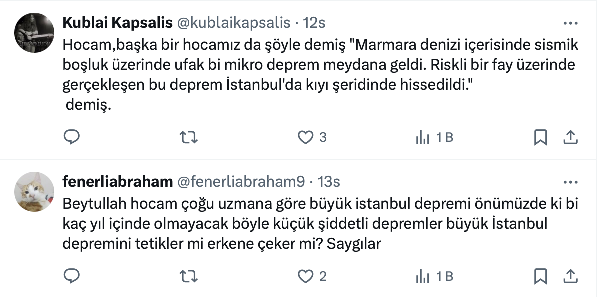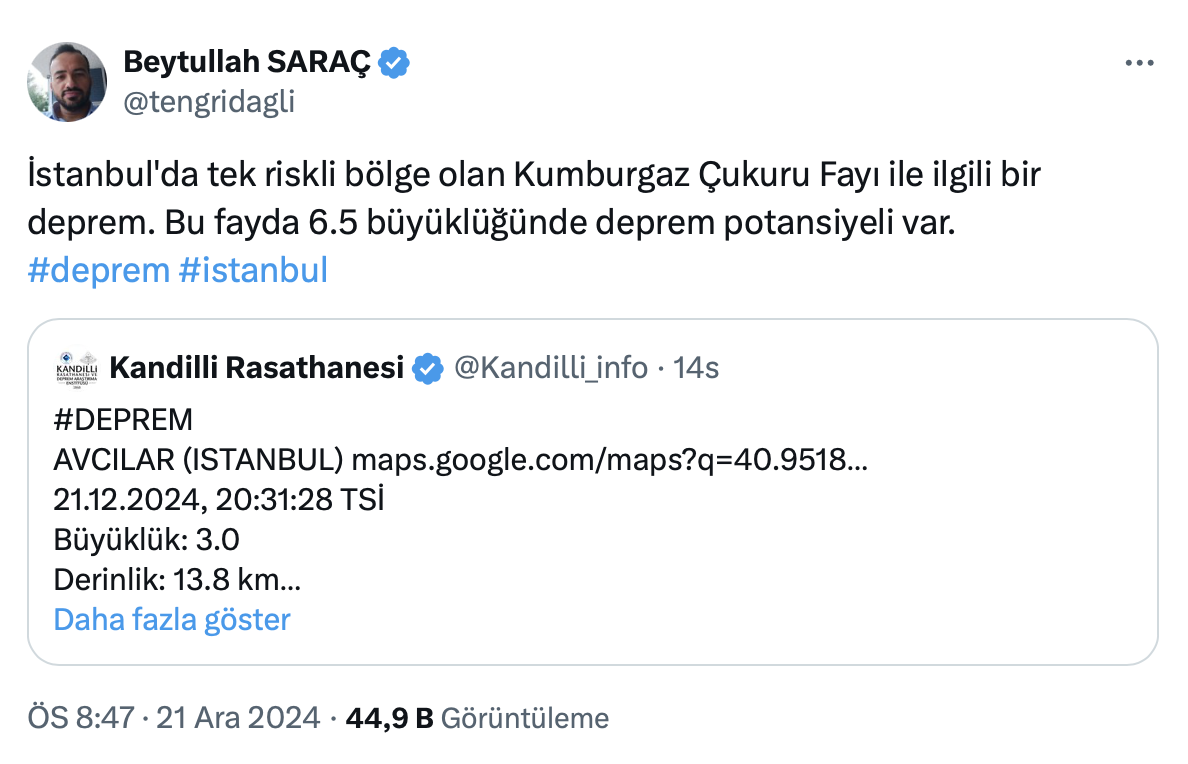 Jeoloji Yüksek Mühendisi Beytullah Saraç resmi sosyal medya hesabı https://x.com/tengridagli üzerinden yaptığı paylaşımda dün meydana gelen depremin, İstanbul'da tek riskli bölge olan Kumburgaz Çukuru Fayı ile ilgili bir deprem olduğunu belirterek, bu fayda 6.5 büyüklüğünde deprem potansiyeli olduğunu söyledi.
