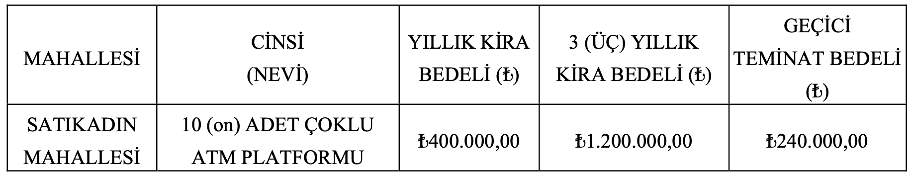 10 ADET ÇOKLU ATM PLATFORMU YERİ 3 (ÜÇ) YILLIĞINA KİRAYA VERİLECEKTİR