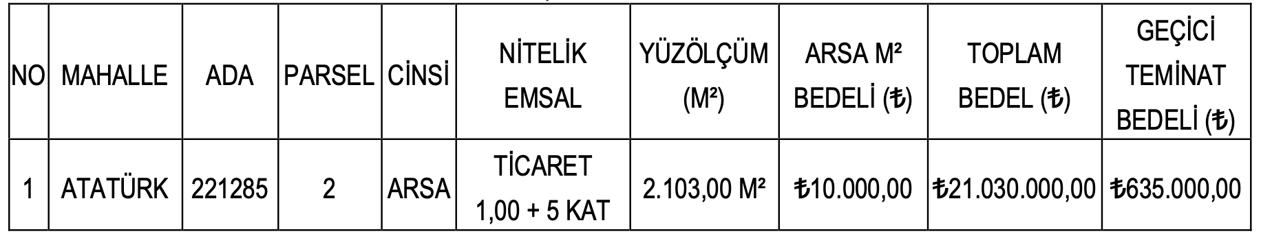 Satışa çıkarılan arsanın muhammen bedeli 21 milyon 30 bin TL olarak açıklanırken, geçici teminat bedeli ise 635 bin TL olarak açıklandı.