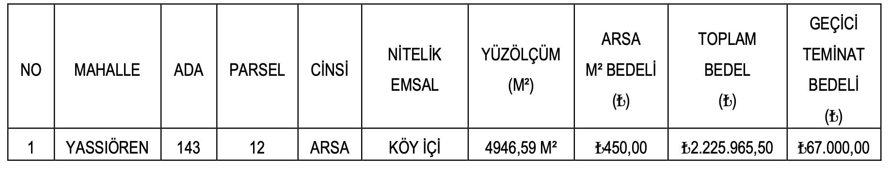 4 bin 946,59 metrekare alana sahip arsanın muhammen bedeli 2 milyon 225 bin 965,50 TL olarak açıklanırken, teminat bedeli ise 67 bin TL olarak açıklandı. Yassıören Mahallesi’nde yer alan arsanın metrekare bedeli 450 TL şeklinde belirtildi.