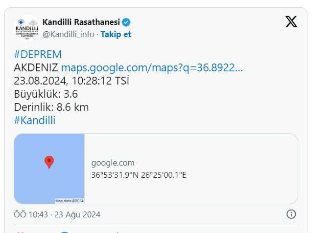 Kandilli Rasathanesi, Adalar Denizi'nde Bodrum açıklarında 3,6 büyüklüğünde bir depremin meydana geldiğini açıkladı. Kandilli Rasathanesi'nin sosyal medya hesabı X üzerinden paylaştığı duyuru kapsamında depremin 8,6 km derinlikte gerçekleştiği ifade edildi.