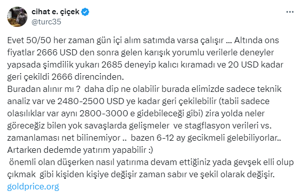 Çiçek, ''altında ons fiyat 2666 USD den sonra gelen karışık yorumlu verilerle deneyler yapsa da şimdilik yukarı 2685 deneyip kalıcı kıramadı ve 20 dolar kadar geri çekildi 2666 direncinden.'' dedi ve 2480-2500 dolara kadar geri çekilebileceğini söyledi.