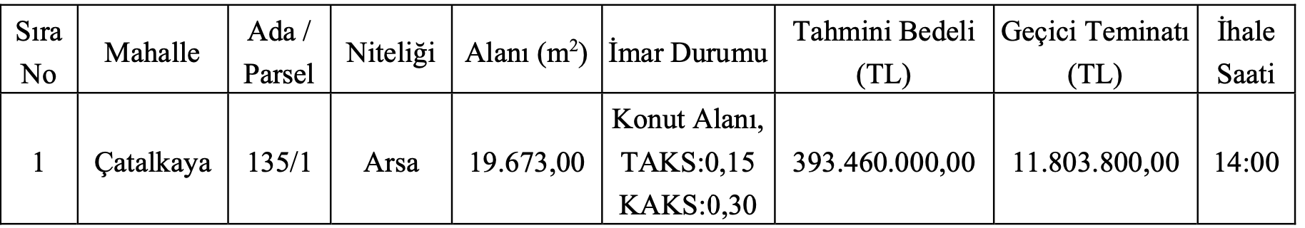 Çatalkaya Mahallesi 135 ada 1 parselde yer alan arazinin satışı 30 Ekim Perşembe günü saat 14:00’te gerçekleştirilecek