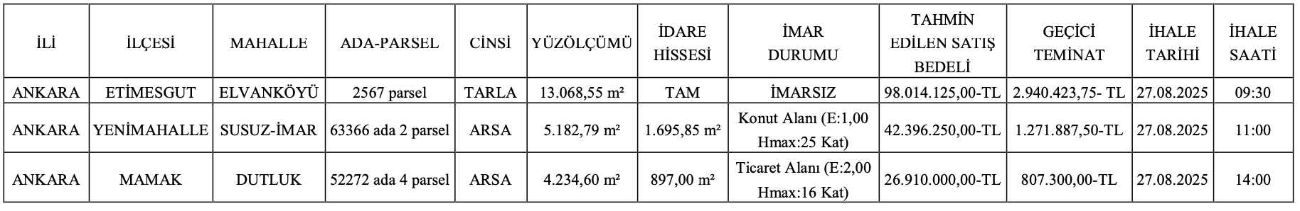 Etimesgut, Yenimahalle ve Mamak’ta yer alan arsa ve arazilerin satış ihalesi 27 Ağustos 2025 tarihinde saat 09.30 ile 14.00 arasında Karayolları 4. Bölge Müdürlüğü’nda yapılacak.