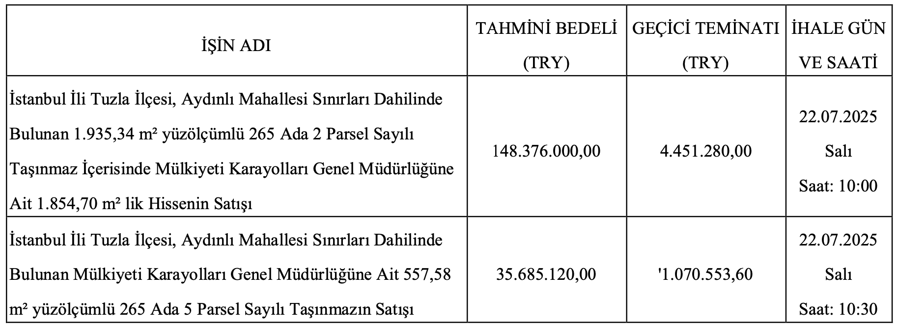 Karayolları Genel Müdürlüğü (KGM), İstanbul'un Tuzla ilçesinde yer alan iki taşınmazı satışa çıkardı. Satış ihalesi 22 Temmuz 2025 tarihinde gerçekleştirilecek.
