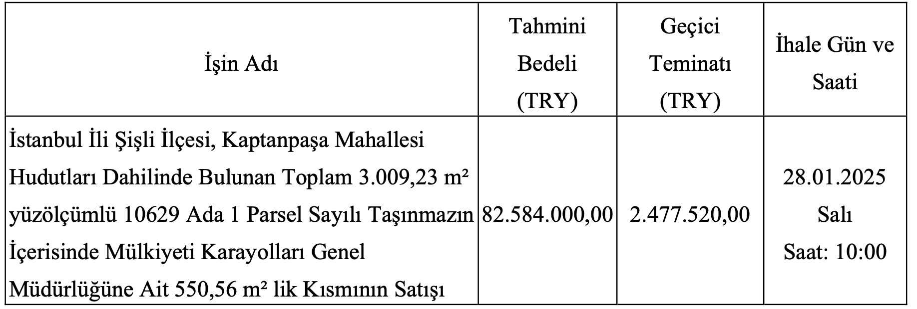 Ulaştırma ve Altyapı Bakanlığı Karayolları Genel Müdürlüğü 1. Bölge Müdürlüğü, Şişli Kaptanpaşa Mahallesi’nde yer alan arsayı satışa çıkardı. 550,56 metrekare alan arsanın satış ihalesi 28 Ocak 2025 tarihinde gerçekleştirilecek.