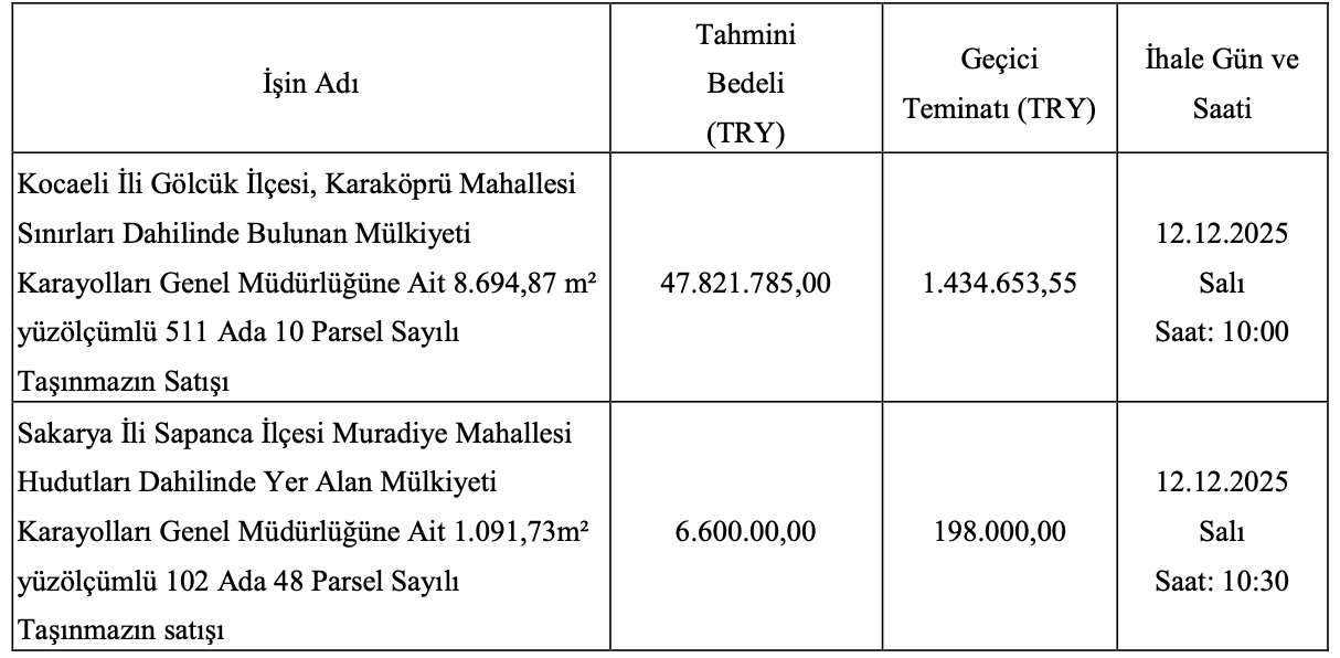 Arazilerin satış ihaleleri 12 Aralık 2025 tarihinde saat 10.00 ve 10.30’da Karayolları 1.Bölge Müdürlüğü İhale Salonunda ihale komisyonunca gerçekleştirilecek.