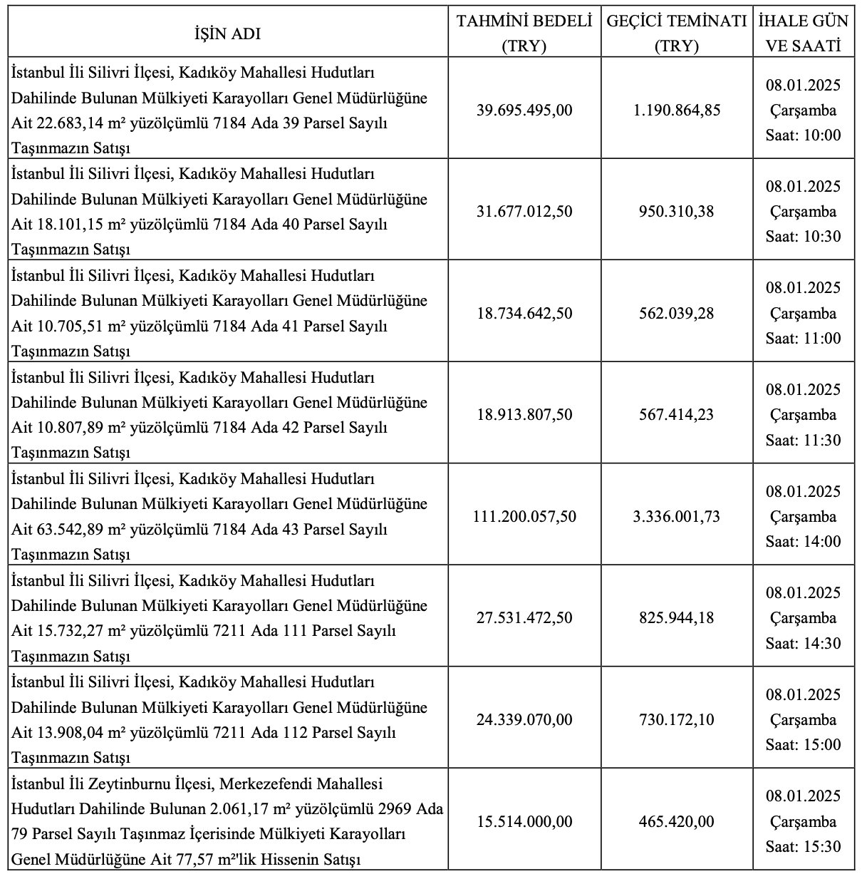 Silivri Kadıköy ve Zeytinburnu Merkezefendi’de yer alan arsa ve arazilerin satış ihaleleri 8 Ocak 2025 tarihinde saat 10.00 ile 15.30 arasında Karayolları 1.Bölge Müdürlüğü İhale Salonunda ihale komisyonunca yapılacak.