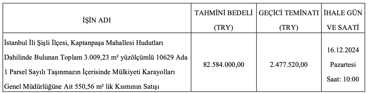 Ulaştırma ve Altyapı Bakanlığı Karayolları Genel Müdürlüğü 1.Bölge Müdürlüğü, İstanbul Şişli’de yer alan arsayı satışa çıkardı. Arsanın satış ihalesi 16 Aralık 2024 tarihinde yapılacak.
