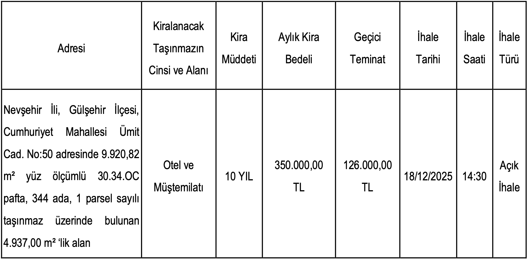 Nevşehir Gülşehir’de yer alan otel 4 bin 937 metrekare alana sahip. Söz konusu otelin kiralama ihalesi 18 Aralık 2025 tarihinde saat 14.30’da Kartal Belediye Başkanlığı Binası Encümen Salonunda yapılacak.