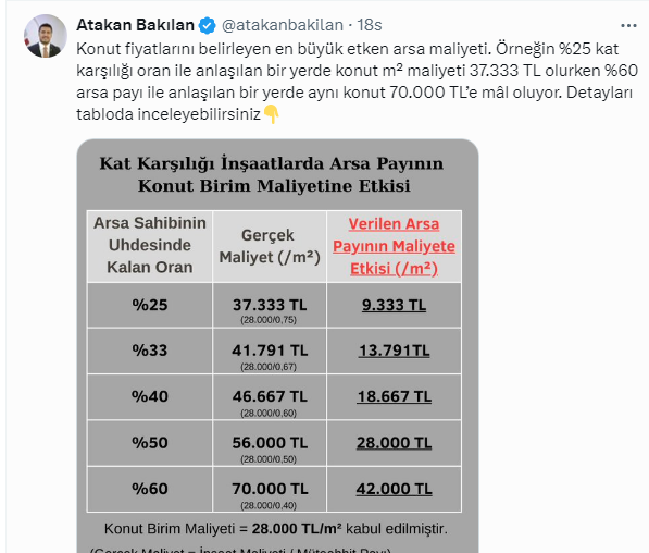 Bakılan sosyal medya hesabı X'ten konuyla ilgili şu ifadeleri kullandı: ''Konut fiyatlarını belirleyen en büyük etken arsa maliyeti. Örneğin yüzde 25 kat karşılığı oran ile anlaşılan bir yerde konut m² maliyeti 37 bin 333 TL olurken yüzde 60 arsa payı ile anlaşılan bir yerde aynı konut 70 bin TL’e mâl oluyor. Detayları tabloda inceleyebilirsiniz.'' dedi. İşte ayrıntılar...