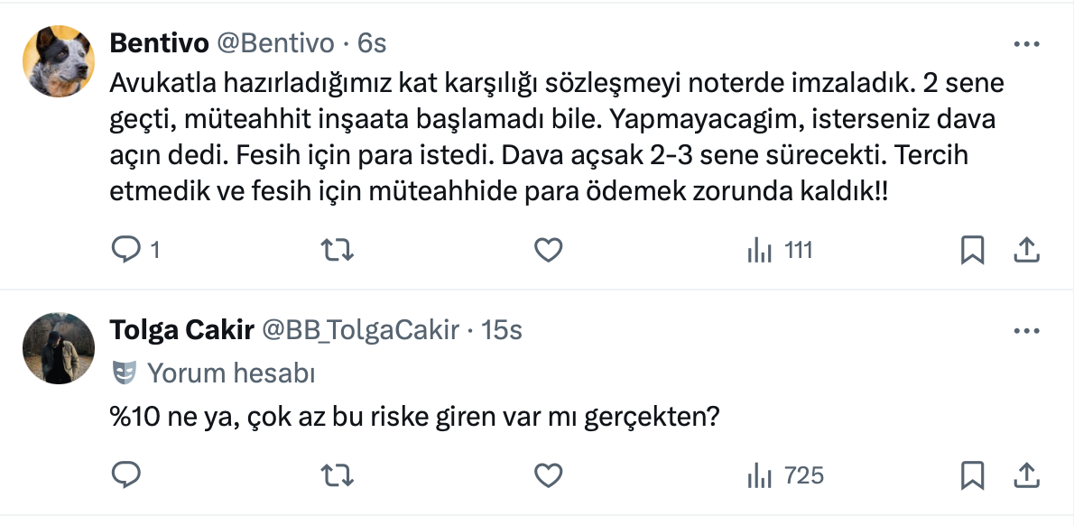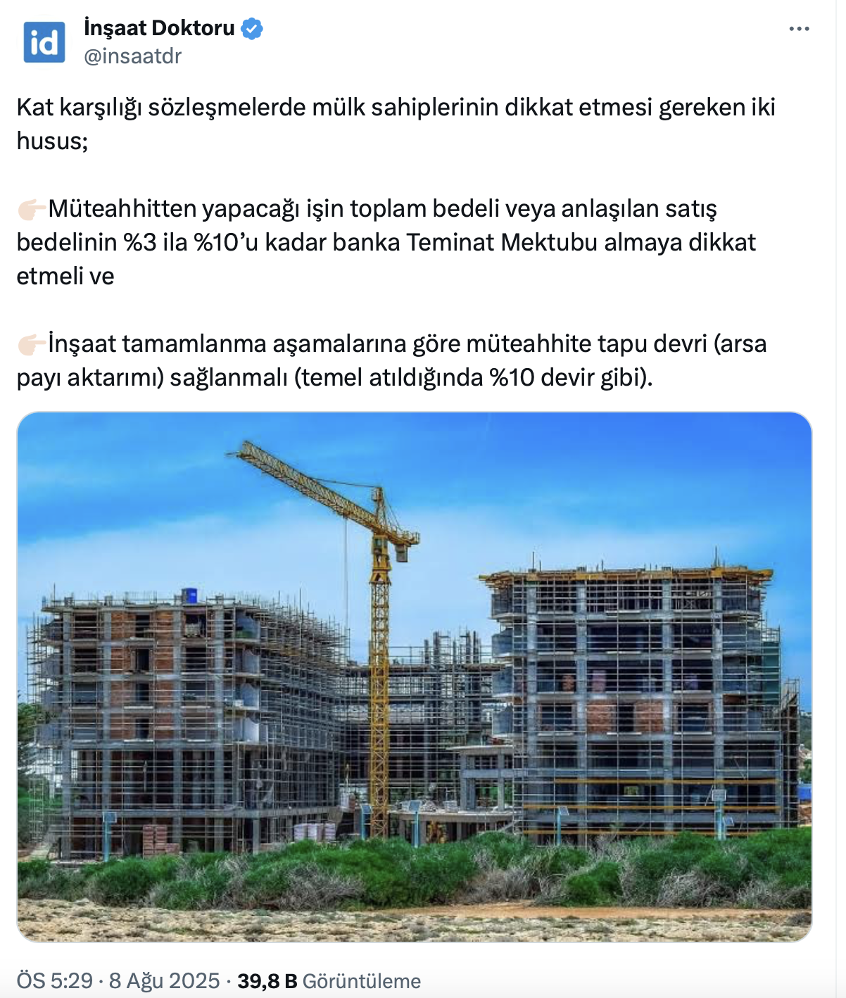 İnşaat Doktoru, resmi sosyal medya hesabı üzerinden yaptığı paylaşımda kat karşılığı sözleşmelerde mülk sahiplerinin dikkat etmesi gereken iki hususu açıkladı.