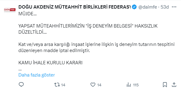 Doğu Akdeniz Müteahhit Birlikleri Federasyonu sosyal medya hesabından söz konusu kararı 'müjde' diyerek açıkladı. İşte o karar...