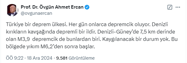 Denizli'de meydana gelen depremin ardından deprem uzmanı Prof. Dr. Övgün Ahmet Ercan'dan açıklama geldi. Ercan, sosyal medya hesabından kaygılanacak bir durum olmadığını söyledi.