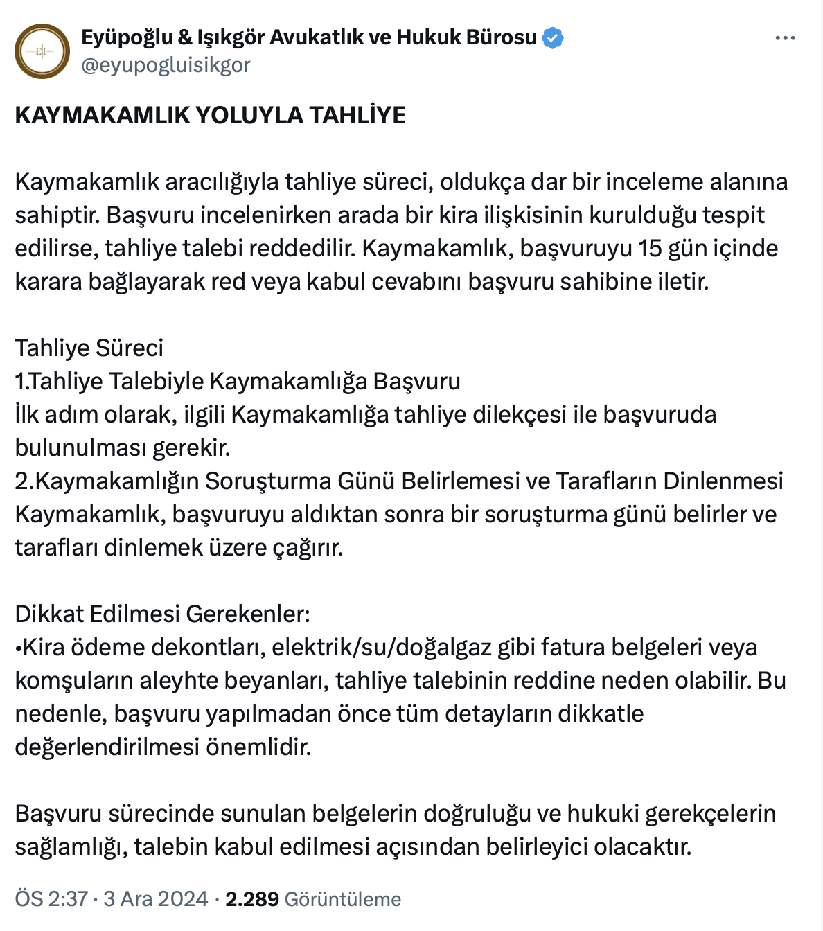 Hem ev sahibi ve hem de kiracı hakları ile ilgili paylaşımları ile önemli detaylara değinen Eyüpoğlu - Işıkgör Avukatlık ve Hukuk Bürosu resmi sosyal medya hesabı https://x.com/eyupogluisikgor üzerinden bu kez de Kaymakamlık yoluyla tahliyeyi yazdı.