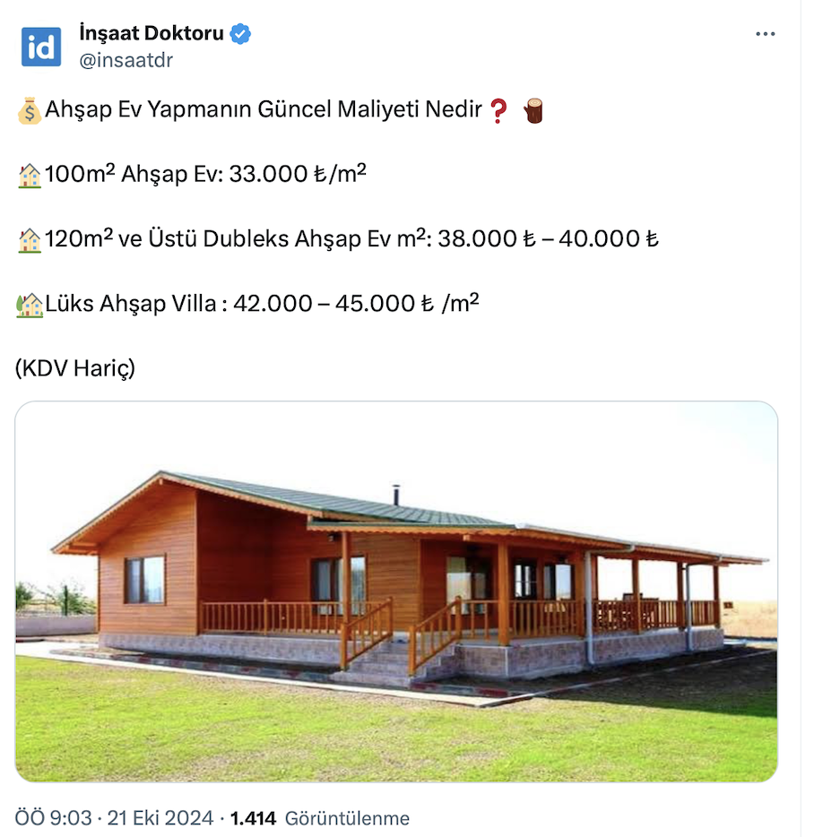 19,2 bin takipçili İnşaat Doktoru resmi X hesabı https://twitter.com/insaatdr üzerinden yaptığı paylaşımda ahşap evlerin güncel maliyetlerini açıkladı.