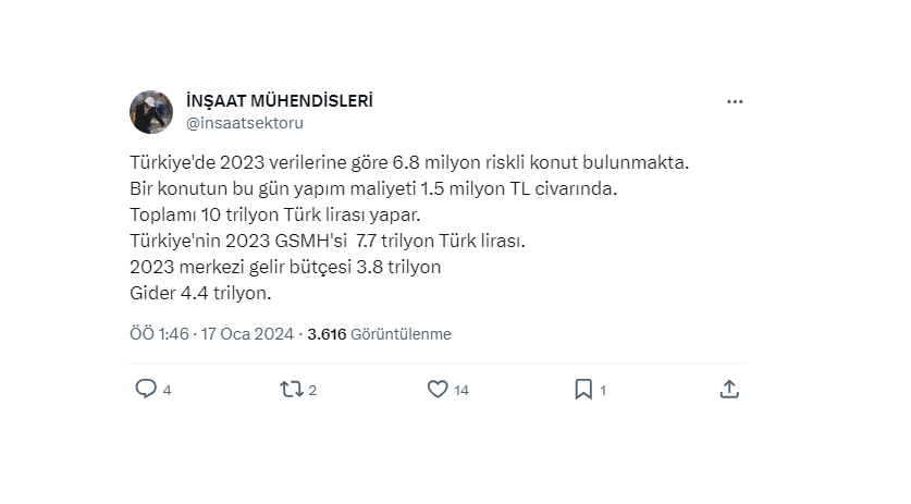 İNŞAAT MÜHENDİSLERİ @insaatsektoru: Tabi bu büyük hesap sanki bütün riskli yapıları vatandaştan hiç para almadan devlet yapacakmış gibi yapılan bir hesap.