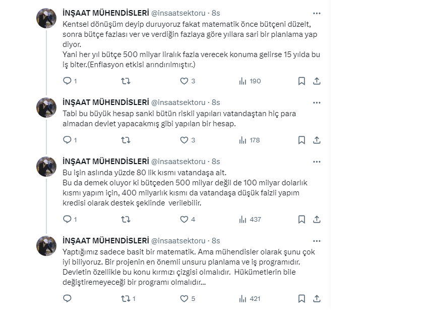 İNŞAAT MÜHENDİSLERİ @insaatsektoru: Bu işin aslında yüzde 80 lik kısmı vatandaşa ait. Bu da demek oluyor ki bütçeden 500 milyar değil de 100 milyar dolarlık kısmı yapım için, 400 milyarlık kısmı da vatandaşa düşük faizli yapım kredisi olarak destek şeklinde verilebilir.