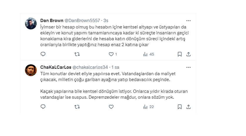 Dan Brown @DanBrown5557: ''İyimser bir hesap olmuş bu hesabın içine kentsel altyapı ve üstyapıları da ekleyin ve konut yapımı tamamlanıncaya kadar ki süreçte insanların geçici konaklama kira giderlerini de hesaba katın dönüşüm süreci içindeki artış oranlarıyla birlikte yaptığınız hesap enaz 2 katına çıkar.''