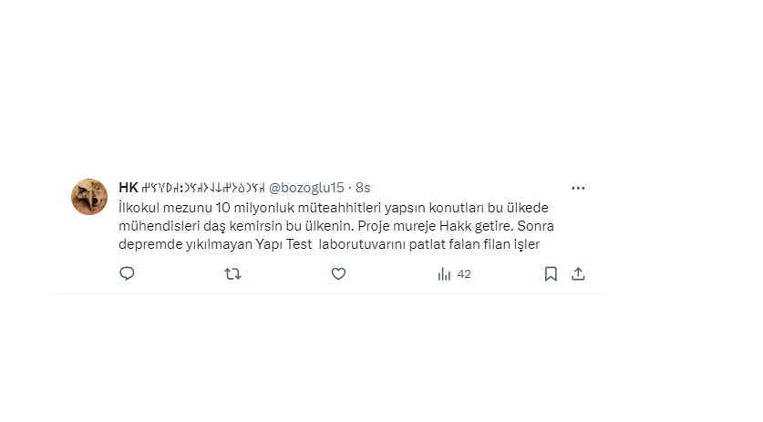 @bozoglu15: ''İlkokul mezunu 10 milyonluk müteahhitleri yapsın konutları bu ülkede mühendisleri daş kemirsin bu ülkenin. Proje mureje Hakk getire. Sonra depremde yıkılmayan Yapı Test laborutuvarını patlat falan filan işler''