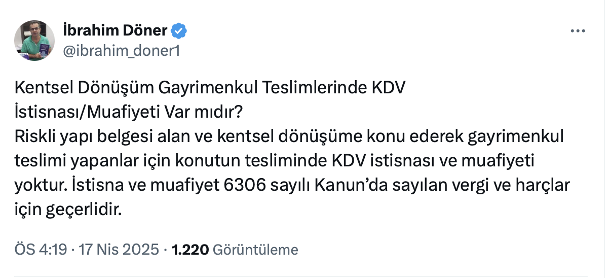 İbrahim Döner yaptığı paylaşımda Kentsel dönüşüm gayrimenkul teslimlerinde KDV istisnası var mı? Sorusuna yanıt verecek şu ifadeleri kullandı: “Riskli yapı belgesi alan ve kentsel dönüşüme konu ederek gayrimenkul teslimi yapanlar için konutun tesliminde KDV istisnası ve muafiyeti yoktur. İstisna ve muafiyet 6306 sayılı Kanun’da sayılan vergi ve harçlar için geçerlidir.”