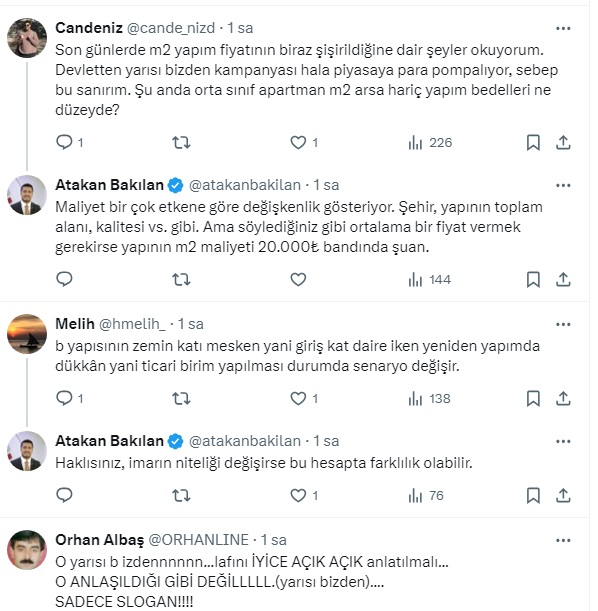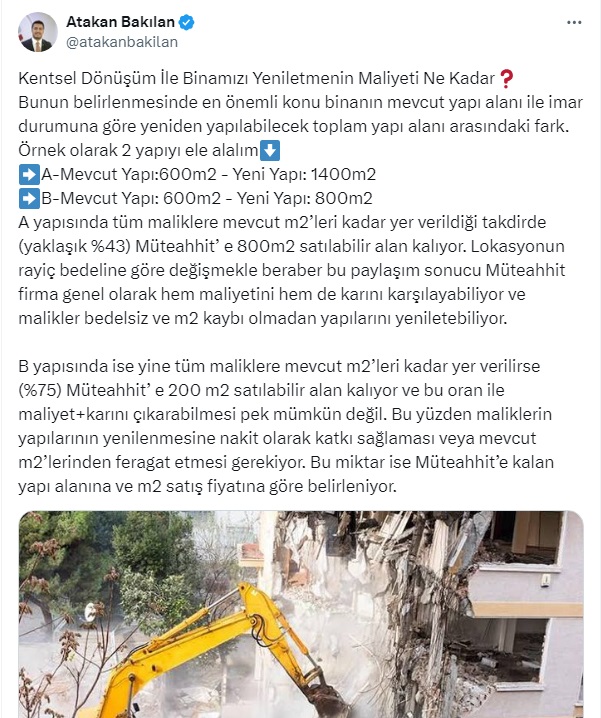 Kentsel dönüşümle bir binayı yeniletme maliyeti binlerce kişi tarafından merak ediliyor. İnşaat Mühendisi, Eskişehir Ticaret Odası Meclis Üyesi ve TOBB Eskişehir Genç Girişimciler Kurulu İcra Komitesi Üyesi Atakan Bakılan resmi sosyal medya hesabı üzerinden Kentsel dönüşümle bir binayı yeniletmenin maliyetini hesapladı. İşte Bakılan'ın o paylaşımı ve gelen yorumlar...