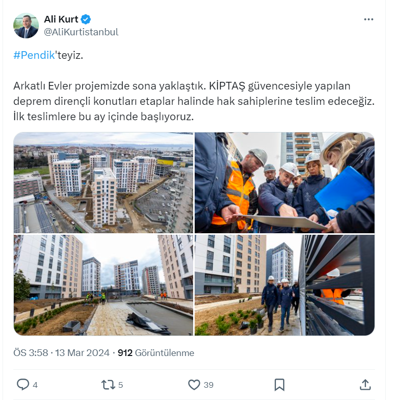 KİPTAŞ Genel Müdürü Ali Kurt resmi sosyal medya hesabı https://twitter.com/AliKurtistanbul üzerinden yaptığı paylaşımda Arkatlı Evler projesinde sona yaklaştıklarını belirterek, "KİPTAŞ güvencesiyle yapılan deprem dirençli konutları etaplar halinde hak sahiplerine teslim edeceğiz. İlk teslimlere bu ay içinde başlıyoruz." ifadelerini kullandı.