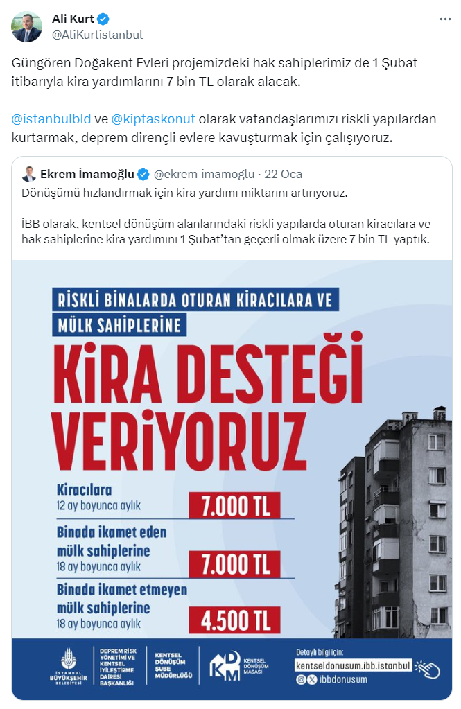 Megakent İstanbul'da kentsel dönüşüm çalışmaları hız kesmeden devam ederken, KİPTAŞ Genel Müdürü Ali Kurt'tan kira yardımı paylaşımı geldi. Ali Kurt yaptığı paylaşımda KİPTAŞ Doğakent Evleri'nde kira yardımının 7 bin TL'ye çıktığını açıkladı.